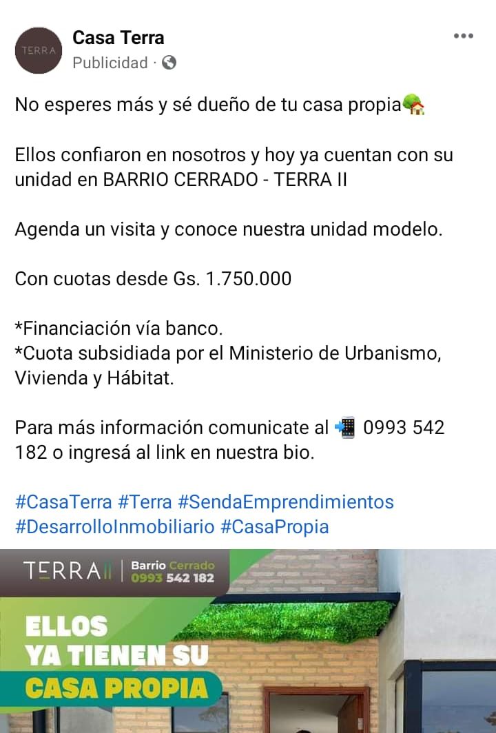 Aclaramos a la ciudadanía en general que lo escrito en esta publicación de Facebook y en otras de la misma cuenta, en la red social instagram, en la que indica que el Ministerio de Urbanismo, Vivienda y Hábitat subsidia las cuotas para el acceso a una vivienda a través de esta página denominada “Casa Terra”, no corresponde. El MUVH no tiene vínculos ni convenio con esta página ni con el emprendimiento citado en la misma.