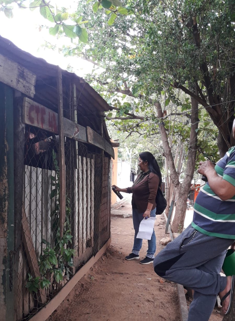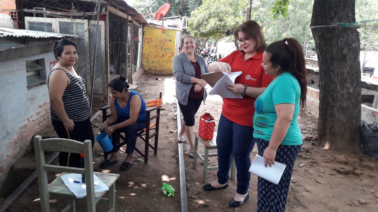 Funcionarios de la Coordinación Social del Programa Che Tapýi continúan realizando trabajos sociales con las familias asentadas en la franja de Dominio de Tren de Cercanías, postulantes a acceder a una de las 600 soluciones habitacionales ejecutadas en el barrio San Blas, de Mariano Roque Alonso.