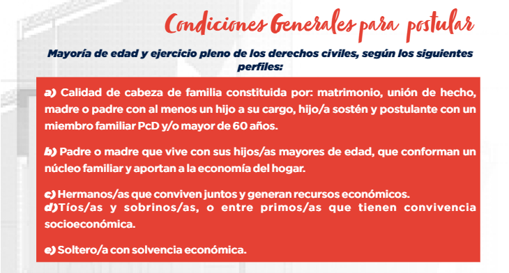El sujeto del crédito y el grupo familiar no deben tener vivienda ni estar realizando trámites de gestión de compra de inmueble o haber sido beneficiados con algún subsidio estatal anterior.