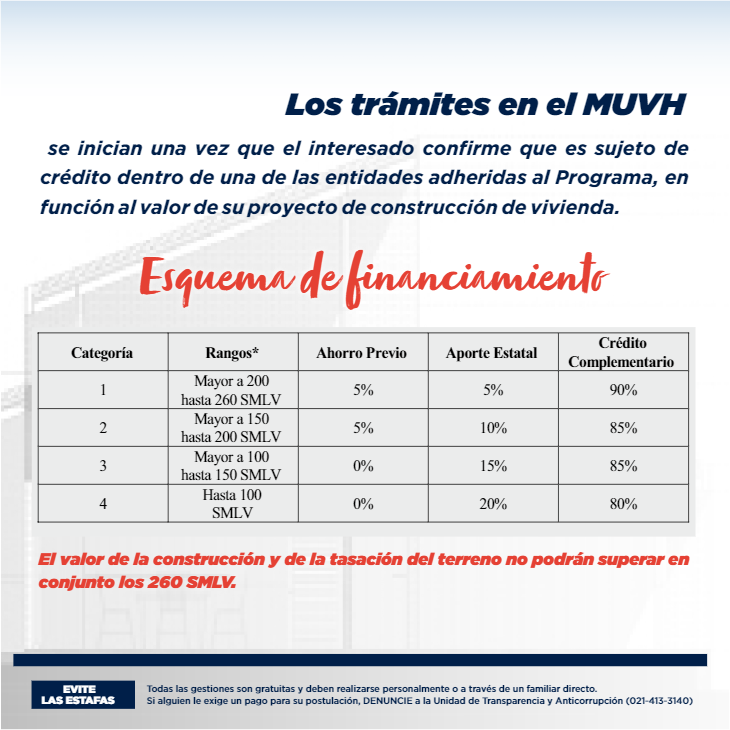 Los trámites en el MUVH se inician una vez que el interesado confirme que es sujeto de crédito dentro de una de las entidades adheridas al Programa, en función al valor de su proyecto de construcción de vivienda.